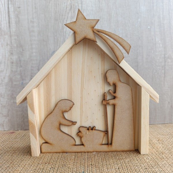 Casita realizada en madera de pino de 16 x 19 cm aproximadamente. Los apliques están realizados en madera de fibrofácil de 3 mm